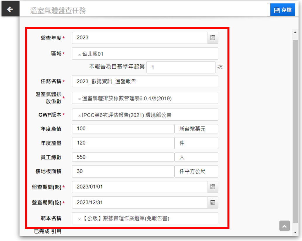 - 「盤查年度」:輸入組織溫室氣體盤查年度,例如:2022。