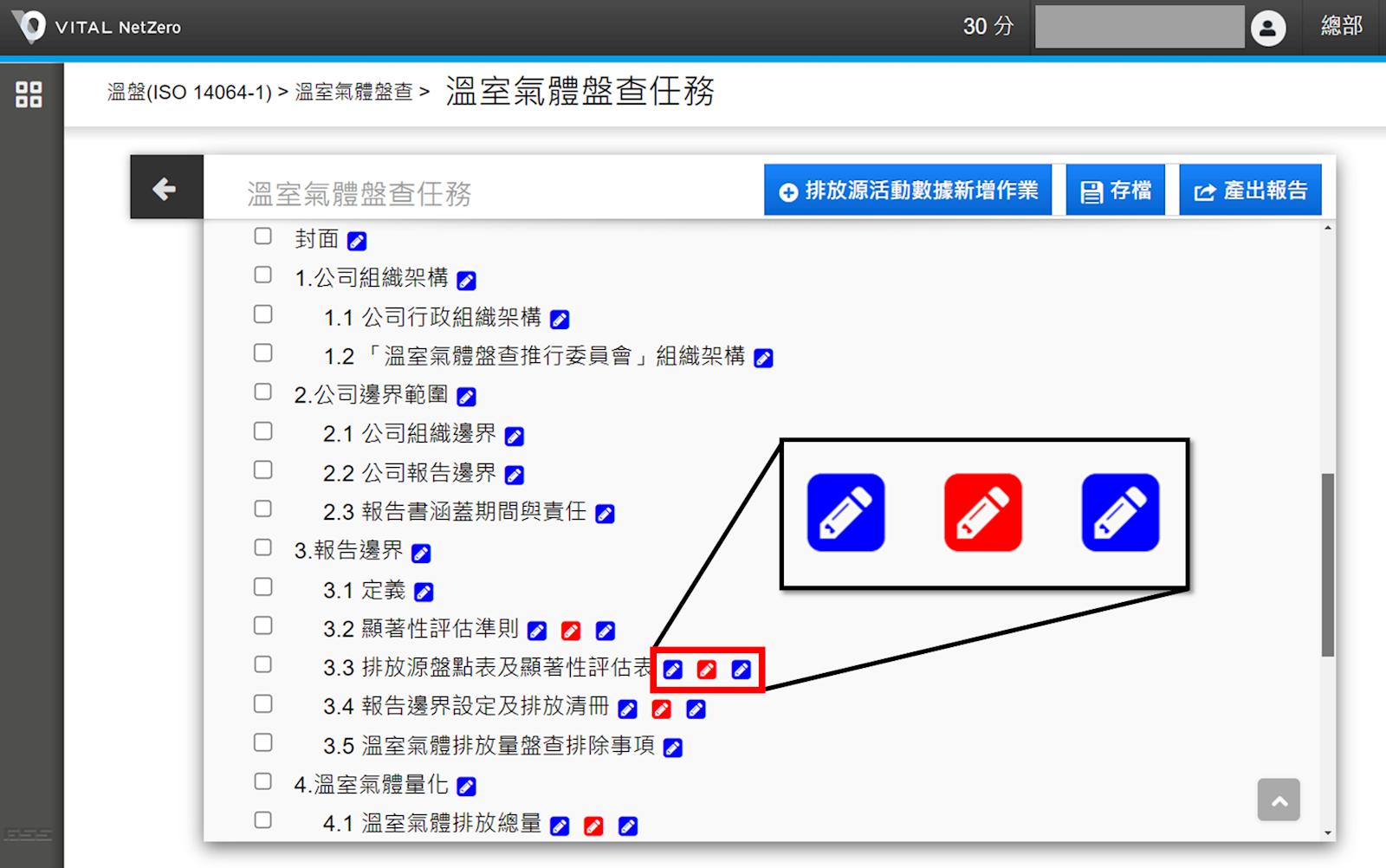 代表是溫室氣體排放項目與排放數據管理、計算與分析等數據相關資料,例如:顯著性評估準則表、排放源盤點表(以顯著性評估表評估決定排放源是否可量化與是否盤點)、排放清冊(包含溫室氣體盤點任務指派、主管覆核以及預覽排放量計算結果)、溫室氣體排放總量計算與統計圖表分析以及溫室氣體排放係數品質說明。系統會自動將數據計算結果放置報告書的內容裡,假設需要針對數據進行詳細說明的話,可以使用前後兩個