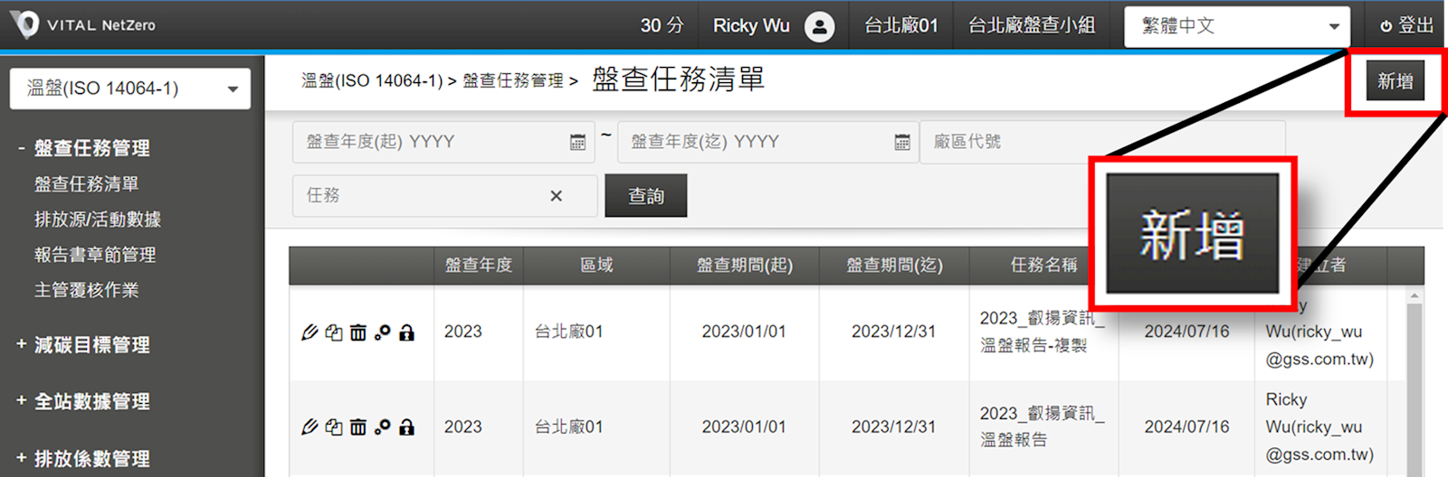 點擊右上角的「新增」即可開始建立一份新的溫室氣體盤查任務,如下圖所示。