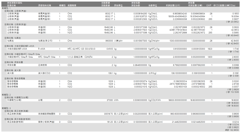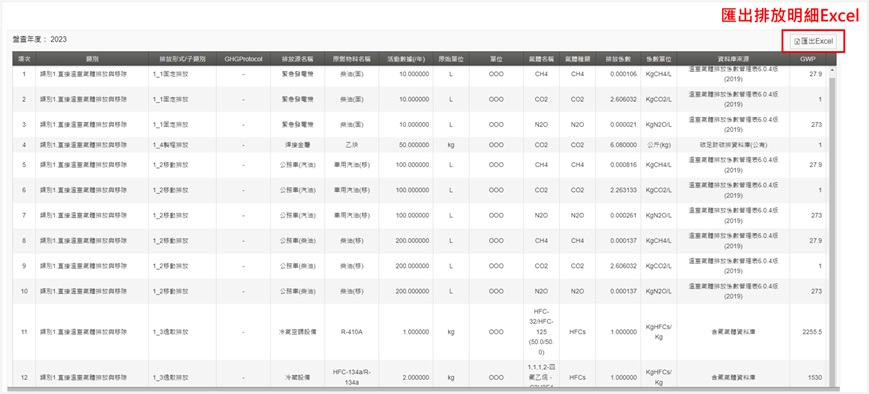 匯出的Excel試算表,可以提供給第三方查驗證單位進行溫室氣體排放計算係數與統計結果的正確性驗算,匯出的排放清冊如下圖所示