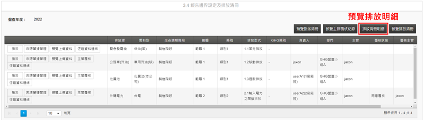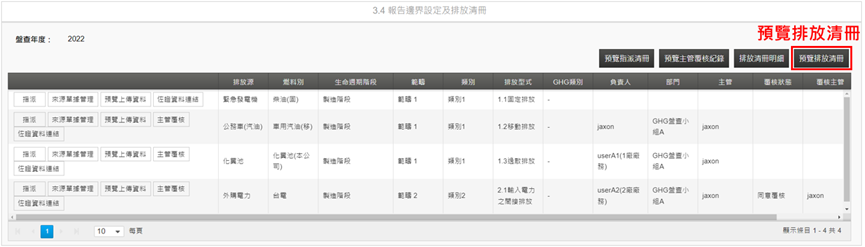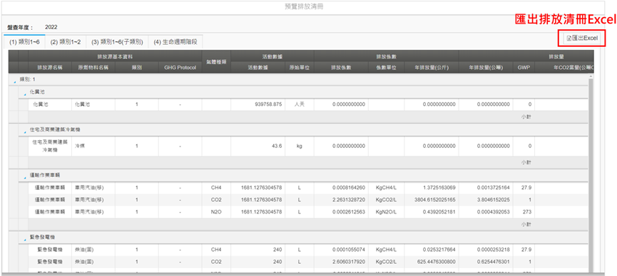 所有排放源的活動數據上傳完成後,可點選「預覽排放清冊」,系統將自動計算CO2排放當量(活動數據×排放係數×GWP),並表列溫室氣體類別1~6之各別單一排放源的排放當量(小計),以及總排放當量彙總(總計)。