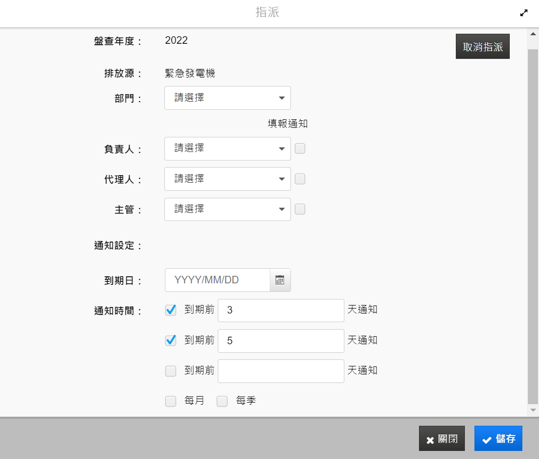 排放清冊【指派】【批次指派】功能,建立活動數填報通知設定,管理者指定填報通知對象、到期日、通知時間(到期日N天前通知)、每季或每月月初提醒,則負責人、代理人及主管可於相關時間收到通知信件。