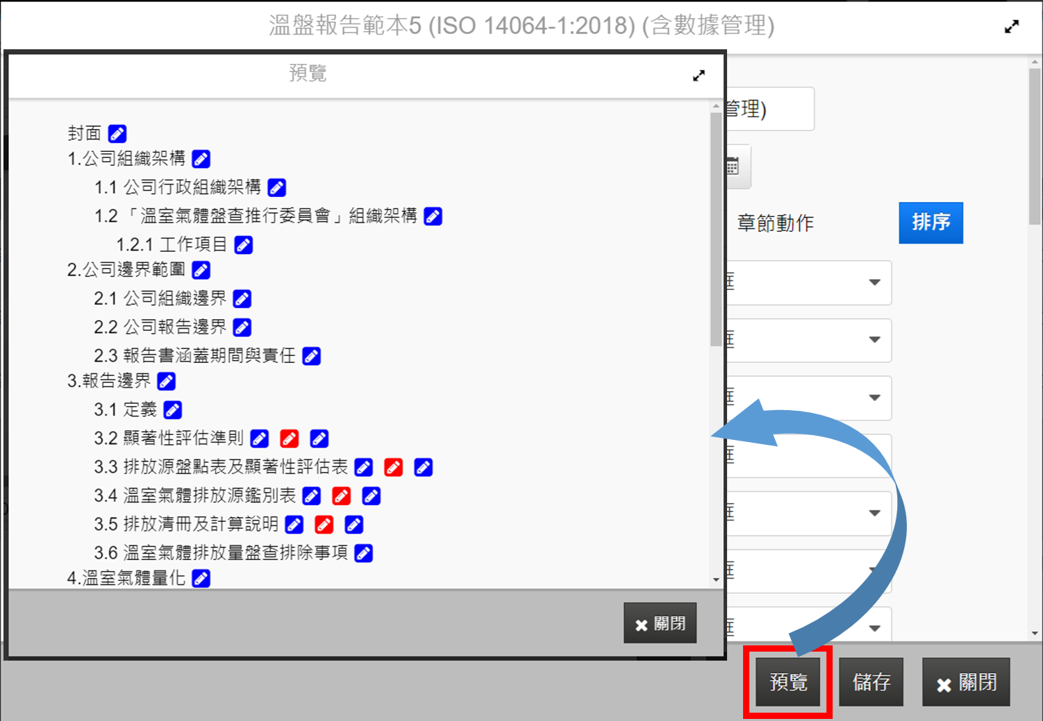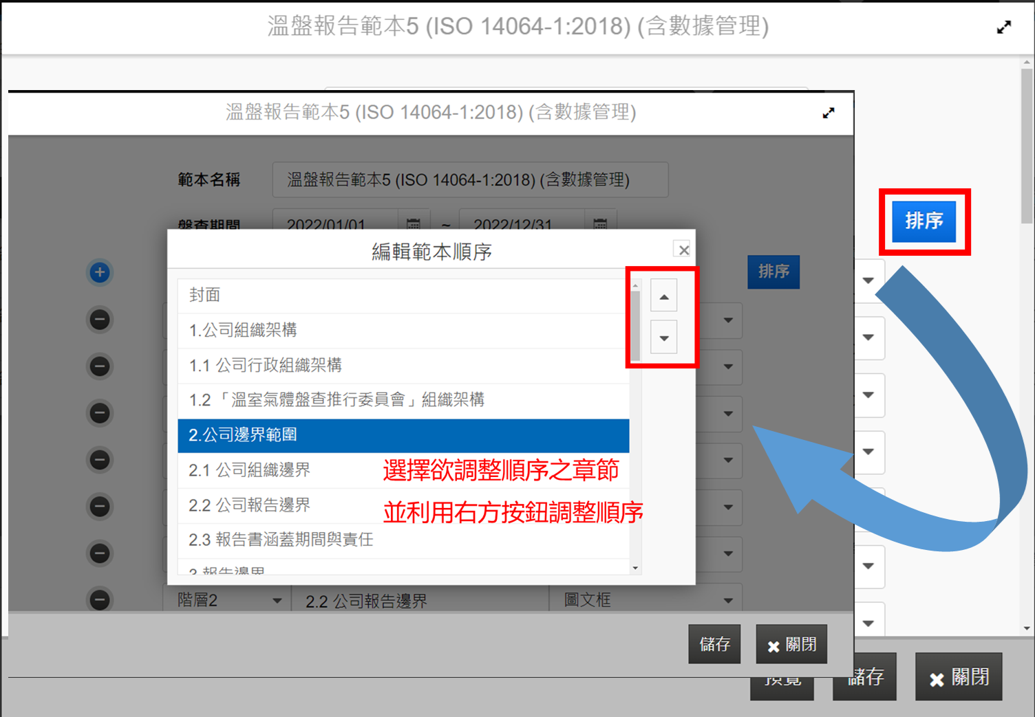 在編輯範本結束後,可透過上方藍色方框的「排序」,調整各章節順序