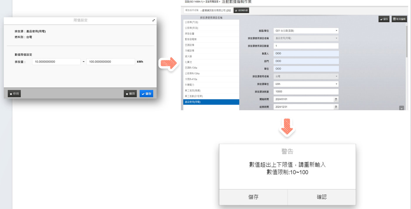 針對單個排放源項目,設定區間值,並且選擇要比對的排放源項目,讓一線人員在上傳活動數據的時候,提示數值不在限定範圍之內,避免上傳錯誤資料,一旦超出區間值的資料被上傳,就觸發警示訊息,提醒一線人員檢視資料是否有誤。