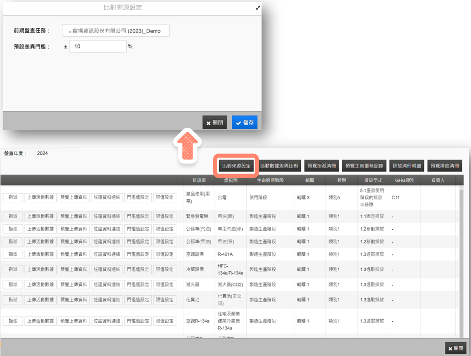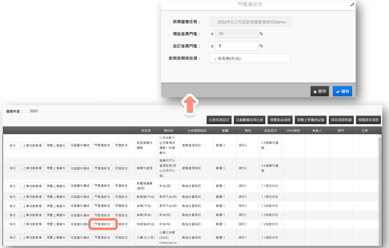 點選【門檻值設定】,填寫【自訂差異門檻】,並在【對照前期排放源】選擇要比對的排放源名稱,如圖所示。