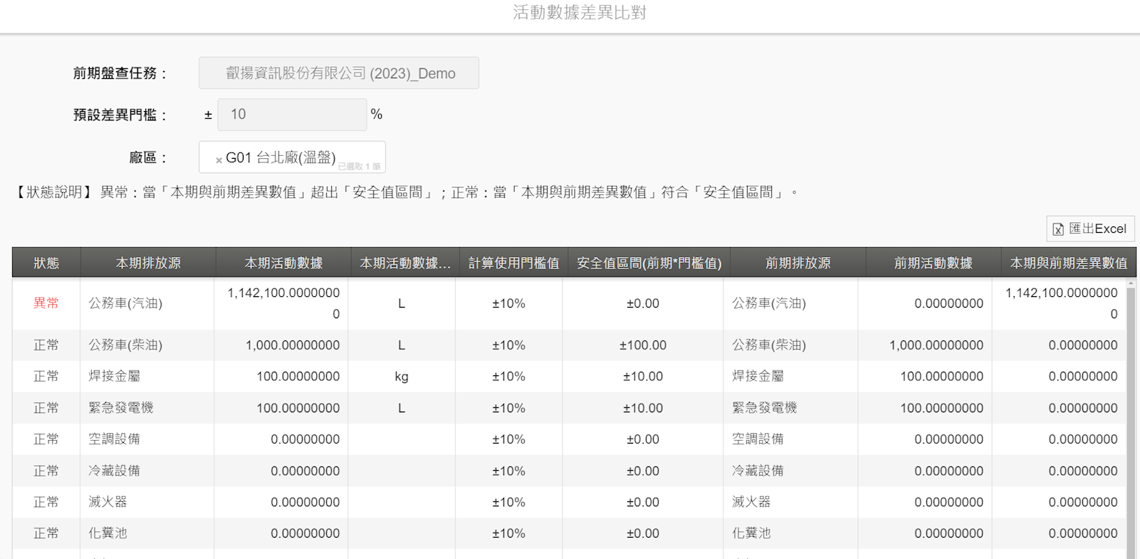 設定完【比對來源設定】、【門檻值設定】、【限值設定】後,點選【活動數據差異比對】,系統將依照設定的區間值偵測所有活動數據資料,進行兩個年度報告任務的數據差異對比,並選擇比較的廠區,若數值超出設定的區間範圍,狀態欄位顯示【異常】,提醒使用者確認與監測活動數據資料是否需要修正,如圖所示。
