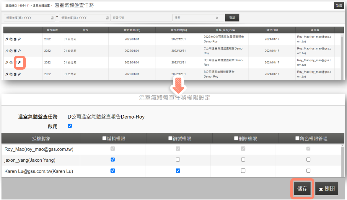 只要使用者擁有【溫盤報告書管理角色】的帳號權限,建立完盤查任務之後,點選設定的圖示,勾選【啟用】之後,使用者可以設定其他使用者這份盤查任務的編輯、複製、刪除以及角色權限的權限設定,其中【角色權限】的功能就是讓其他使用者可以擁有設定報告書權限的功能,如果我們想要給A同仁編輯2022年的盤查任務,給B同仁複製2022年的盤查任務的話,可以透過這個功能滿足需求。