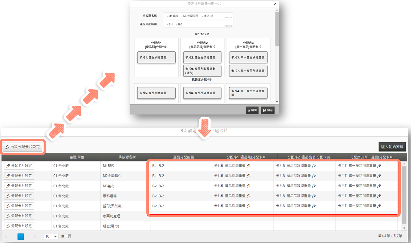 在【批次分配卡片設定】功能,使用者可以選擇多個【排放源名稱】與【產品分配範圍】之後,再根據分配序1、分配序2、分配序3設定分配卡片的參數,點選【儲存】後,就可以一口氣設定多項排放源的分配卡片。