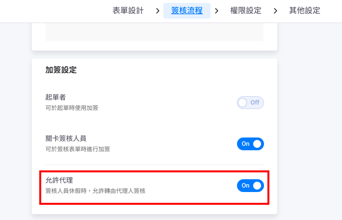 請進入表單樣板設計的畫面,切換到「簽核流程」,下拉到「加簽設定」區塊,於「允許代理」欄位設定開啟或關閉。