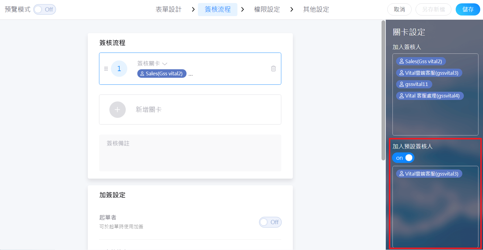 若要將此關卡內的其中一位簽核人設為預設,可以開啟【加入預設審核者】,並選擇預設的人員