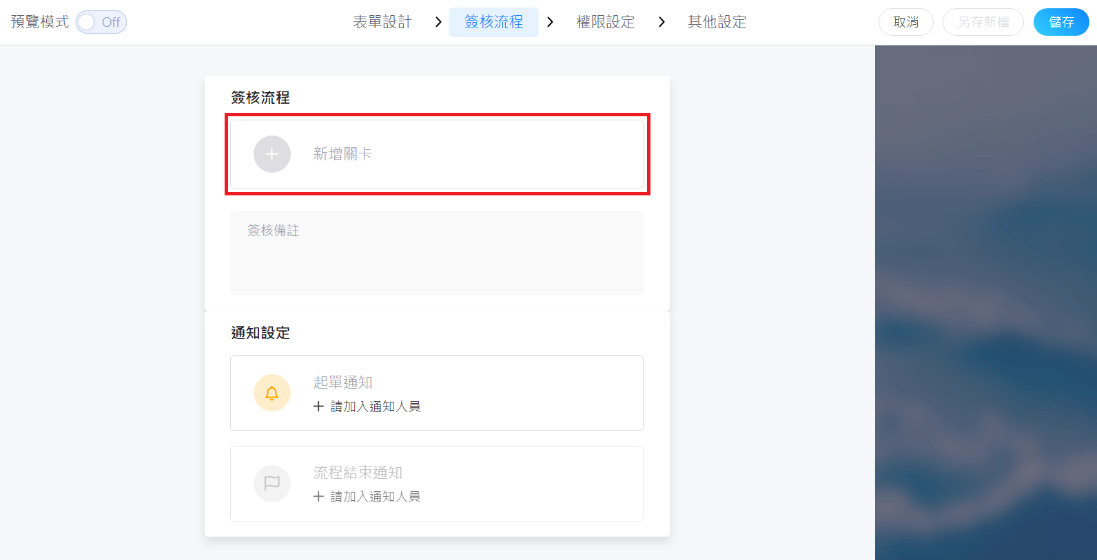 您就可以開始新增簽核關卡,點選【新增關卡】