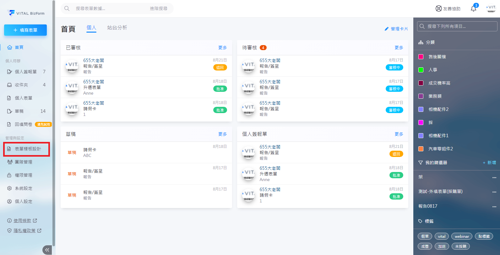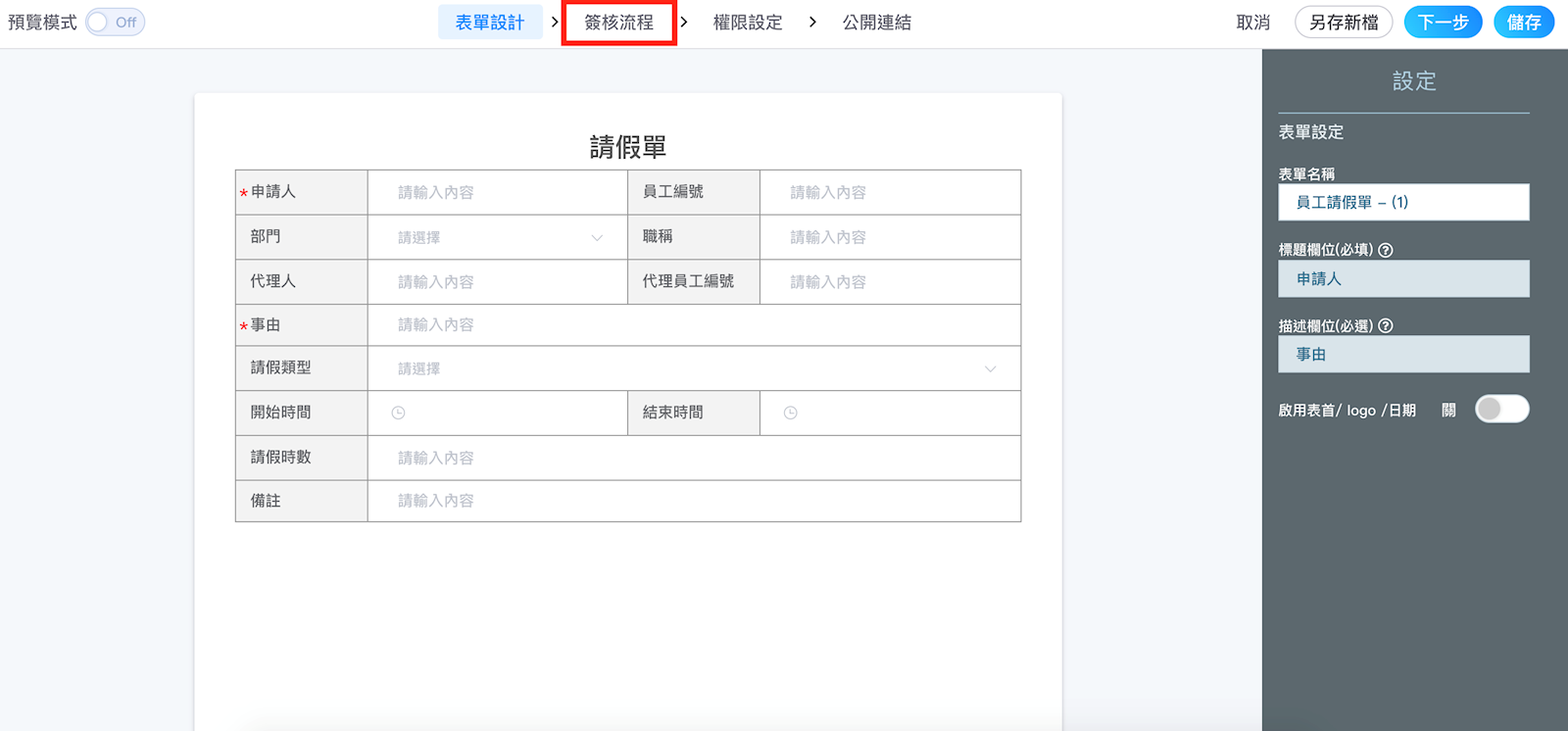 若要將表單內的簽核流程刪除,請點選畫面左方的【表單樣本設定】
