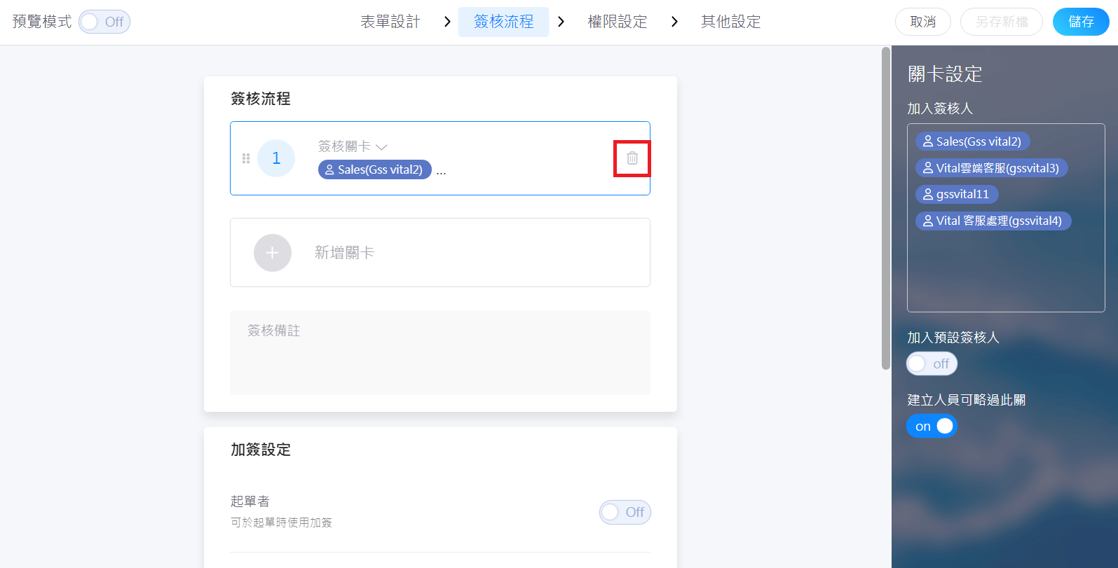 關卡右方有個垃圾桶標示,若確定要刪除流程請點選【垃圾桶】即可刪除