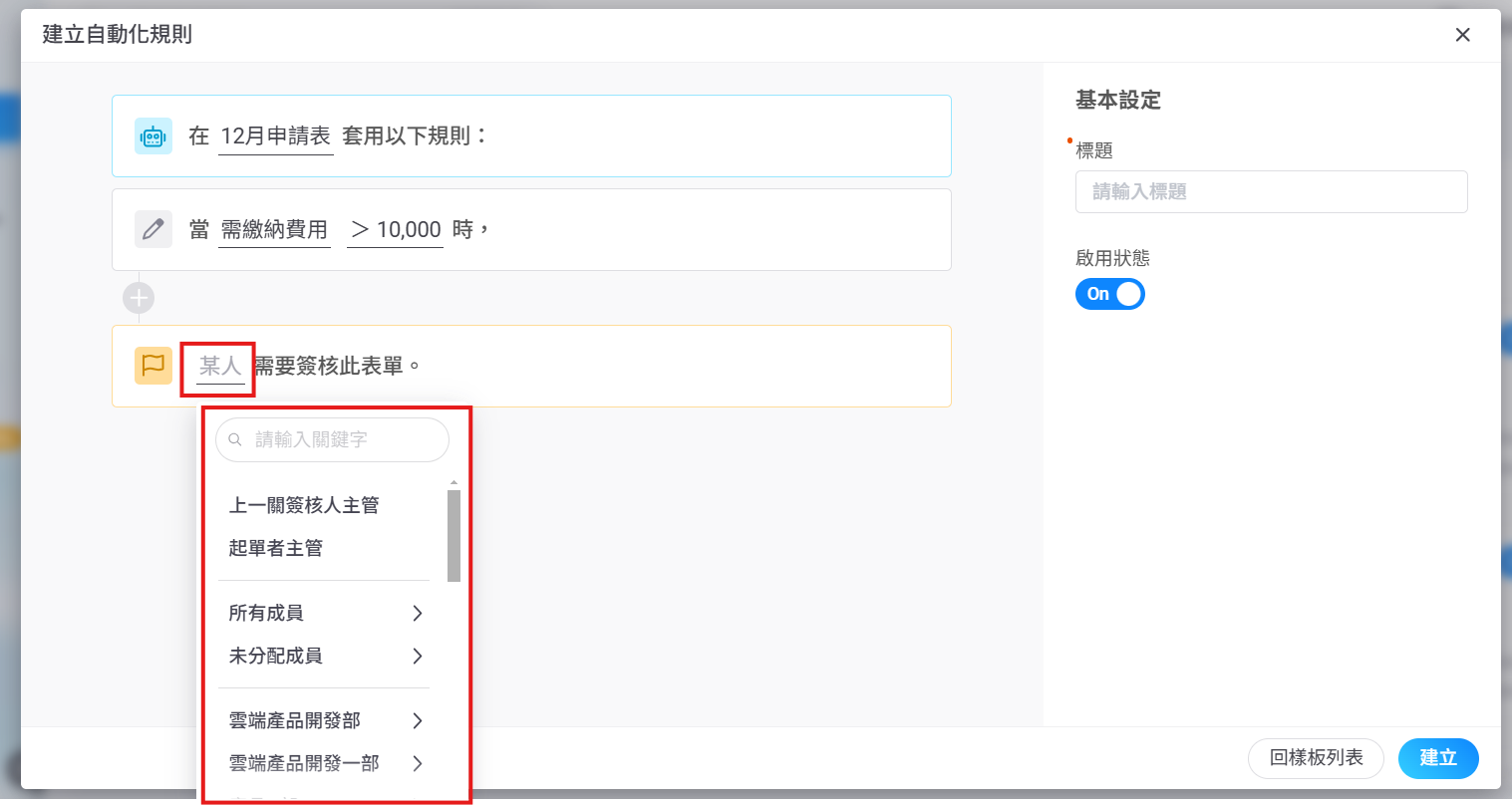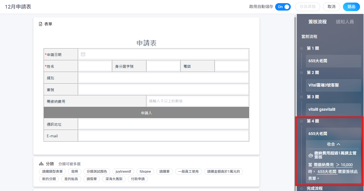 5. 設定符合條件的簽核人(目前僅可加入一關簽核)。