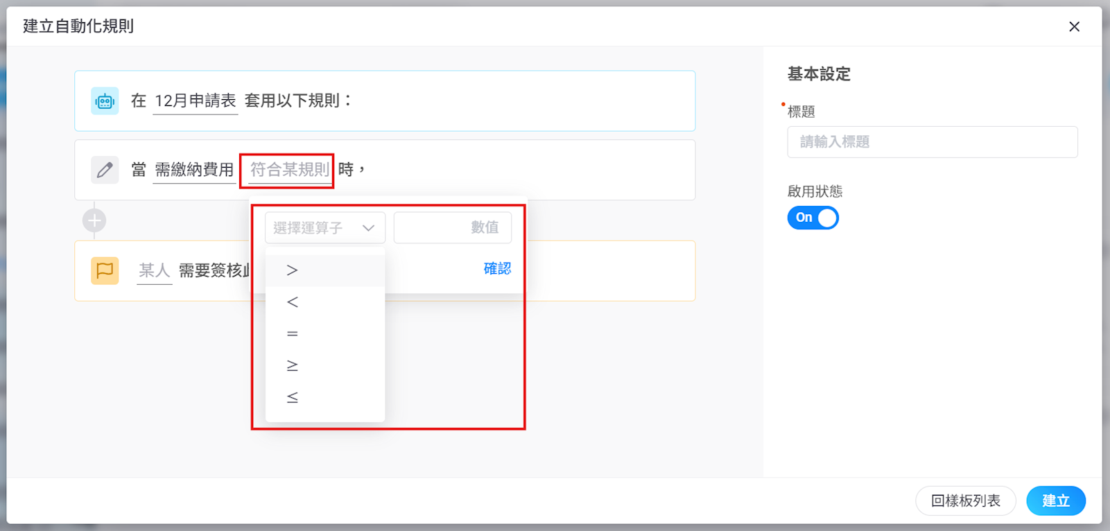 6. 右邊輸入標題,並將啟用狀態設置為On,按【建立】即完成。