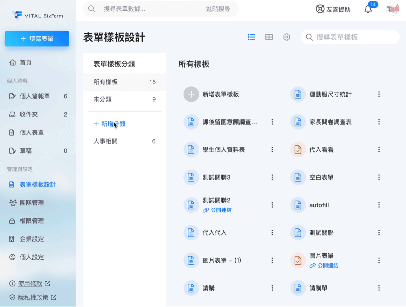 按住表單樣板分類前端的圖示,即可拖曳項目進行排序。