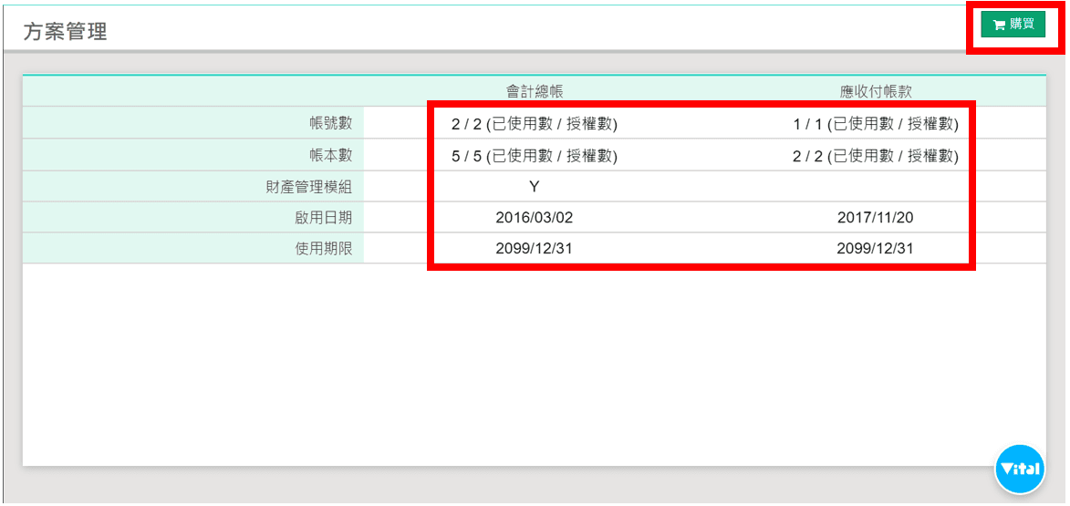 您可以點選系統管理>>方案管理,點選進入後即可查詢貴公司的帳本已使用數與授權數,若想增加帳本數可以點選右上方的加購來加購帳本。
