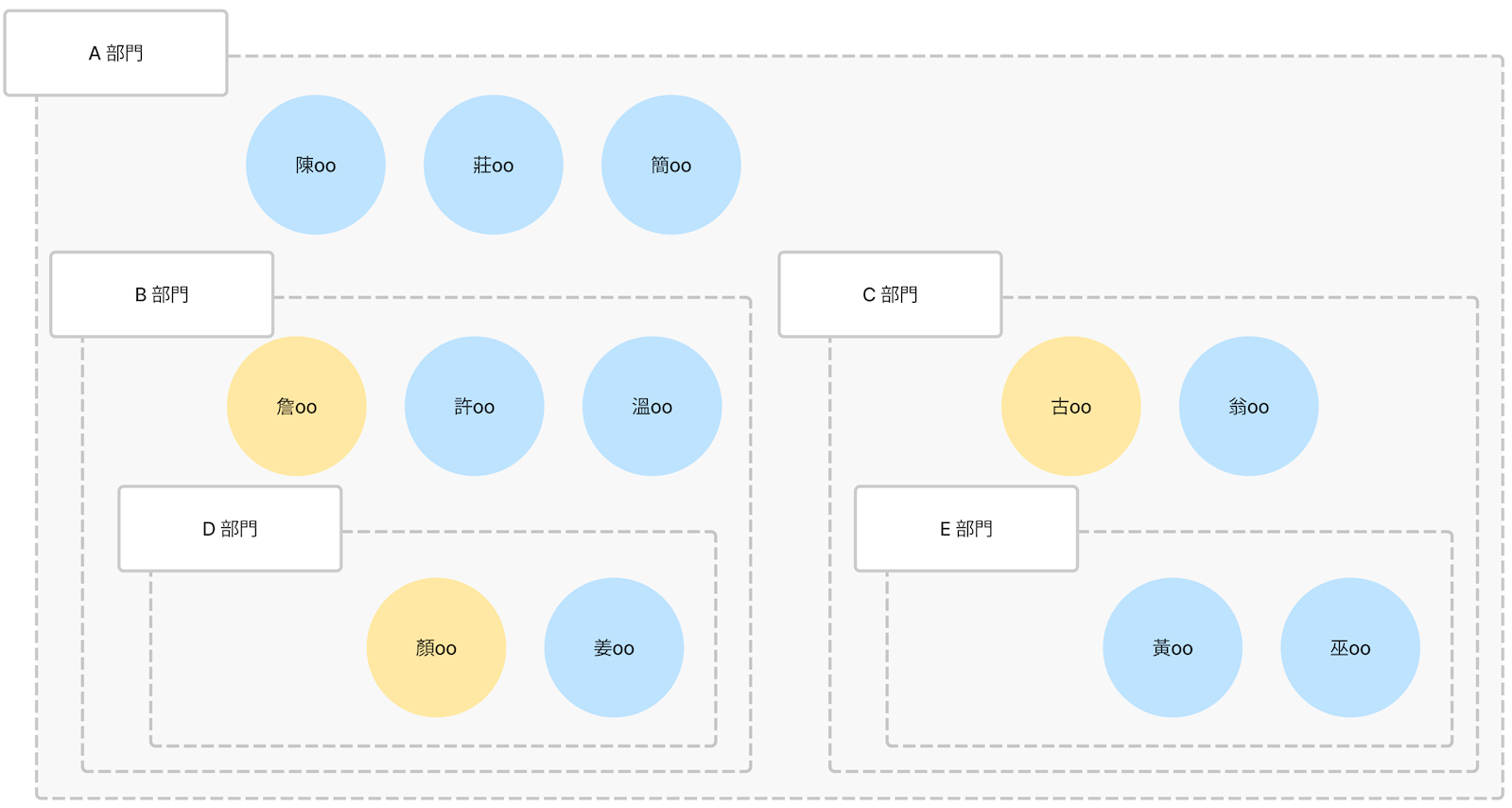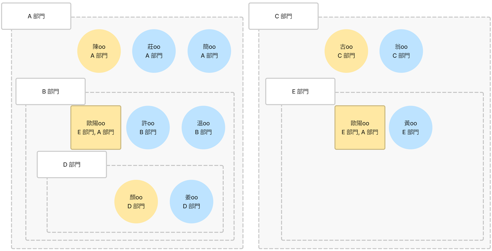 因為第三關的 歐陽oo 所屬的第一個組織為 E 部門,因此會從 E 部門再往上找到 C 部門的主管,所以第四關的審核人為 古oo 而非 陳oo。