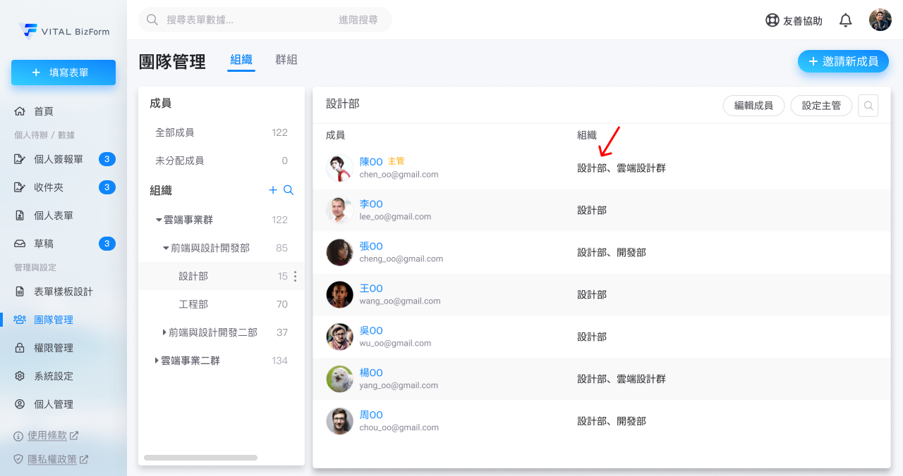 - 於團隊管理頁面中,可以看見使用者所屬哪些組織