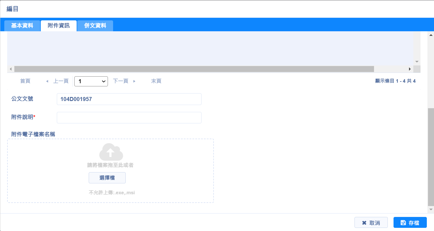 *請注意,若公文已經發文或已送歸檔並完成編目,皆不可修改及上傳附件。