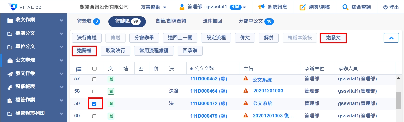 勾選單一份公文後,點選【送發文】或【送歸檔】。