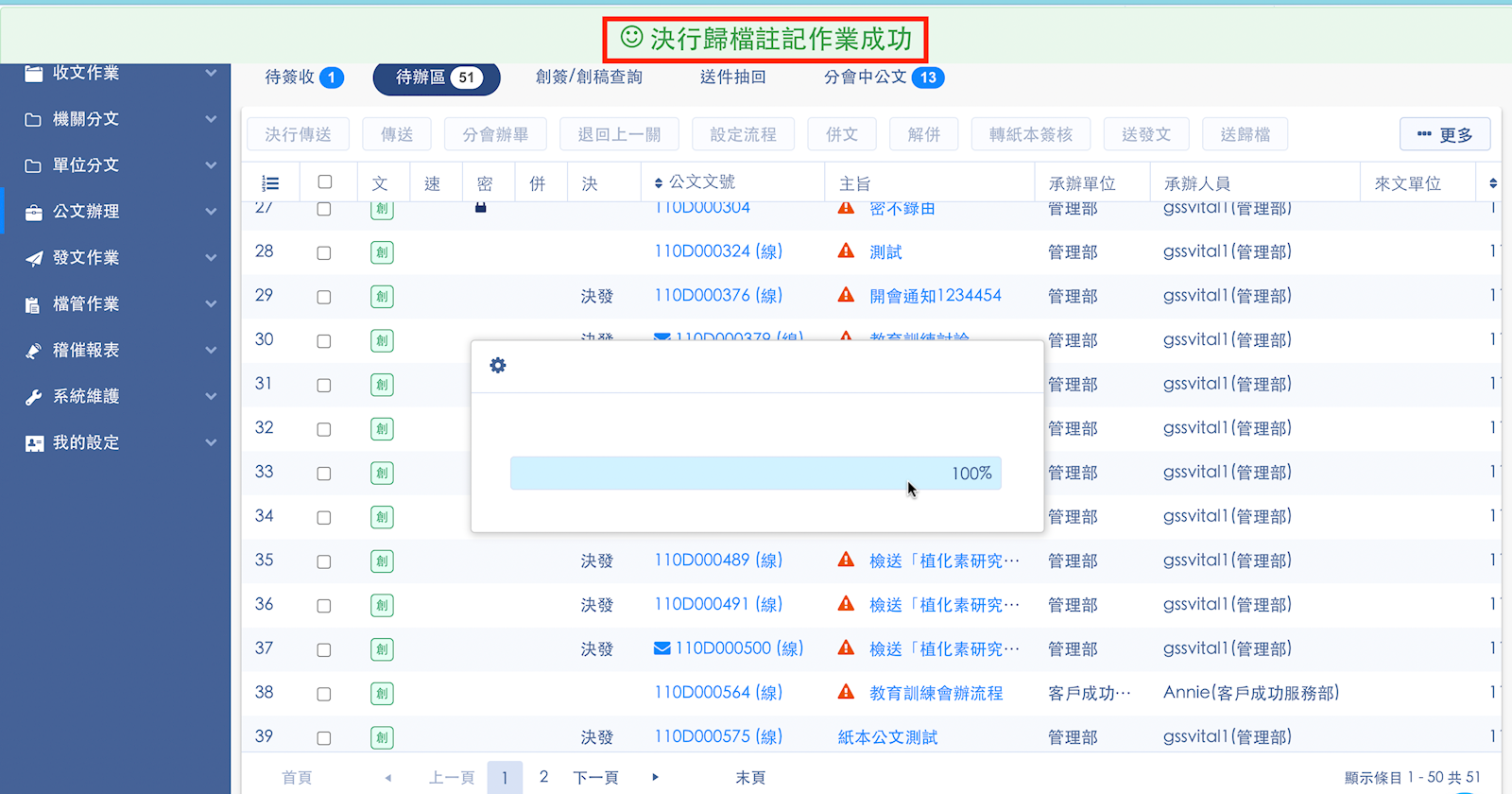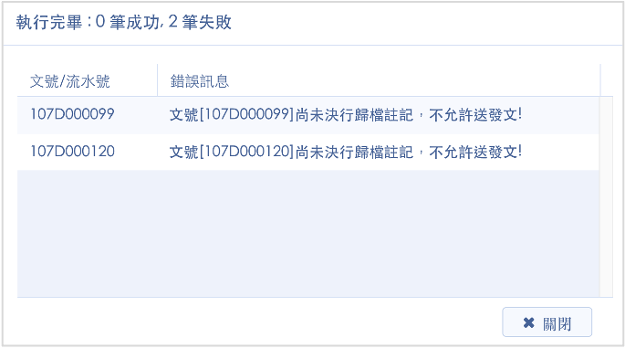 因系統需將每份公文壓上決行資訊,故不支援整批送發文/送歸檔,若出現下圖的失敗訊息,請您逐一執行送發文/送歸檔。