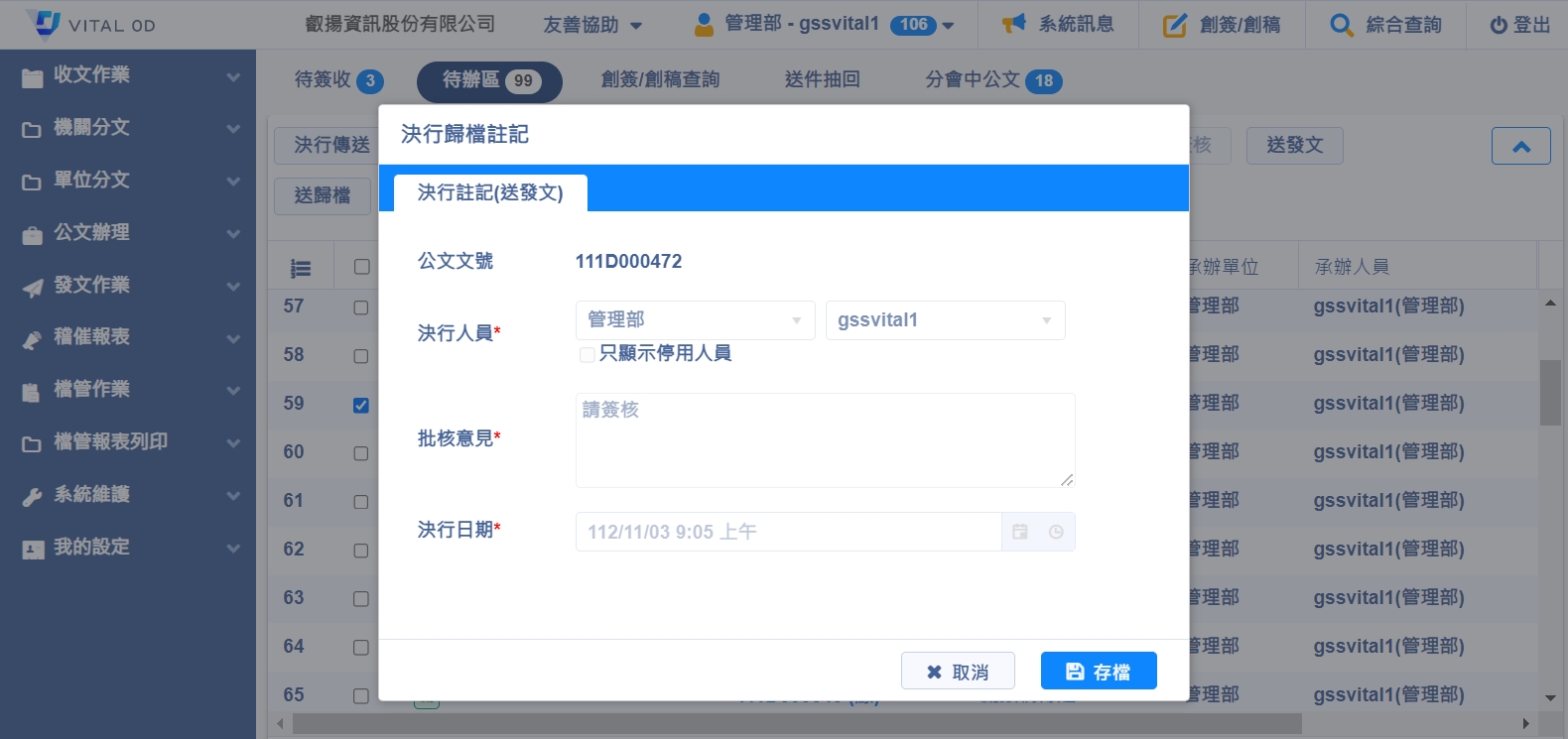 線上簽核公文的「決行歸檔註記」的畫面如下,系統會自動帶入決行人員、批核意見、決行日期等資訊,確認資訊無誤後,點擊右下角「存檔」即可。