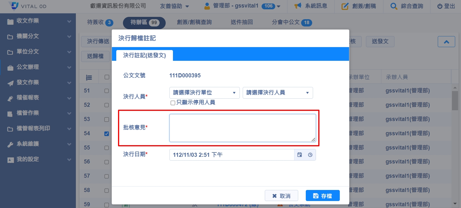 紙本簽核公文的「決行歸檔註記」的畫面如下,因為簽核意見都寫在紙本上,所以承辦人需要手動輸入批核意見,確認資訊無誤後,點擊右下角「存檔」即可。