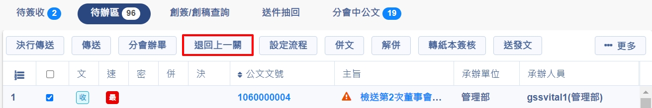 若公文需退回至上一關人員再辦理,可在公文辦理的待辦區選擇公文後,點選上方的退回上一關按鈕,公文會退回至上一關的待辦區。