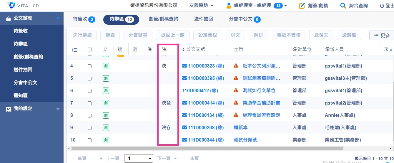 如果在公文列表上,在文號前方有出現「決存」代表曾經送歸檔但被退回;出現「決發」代表曾經送發文但被退回;出現「決」代表公文已經被決行了。