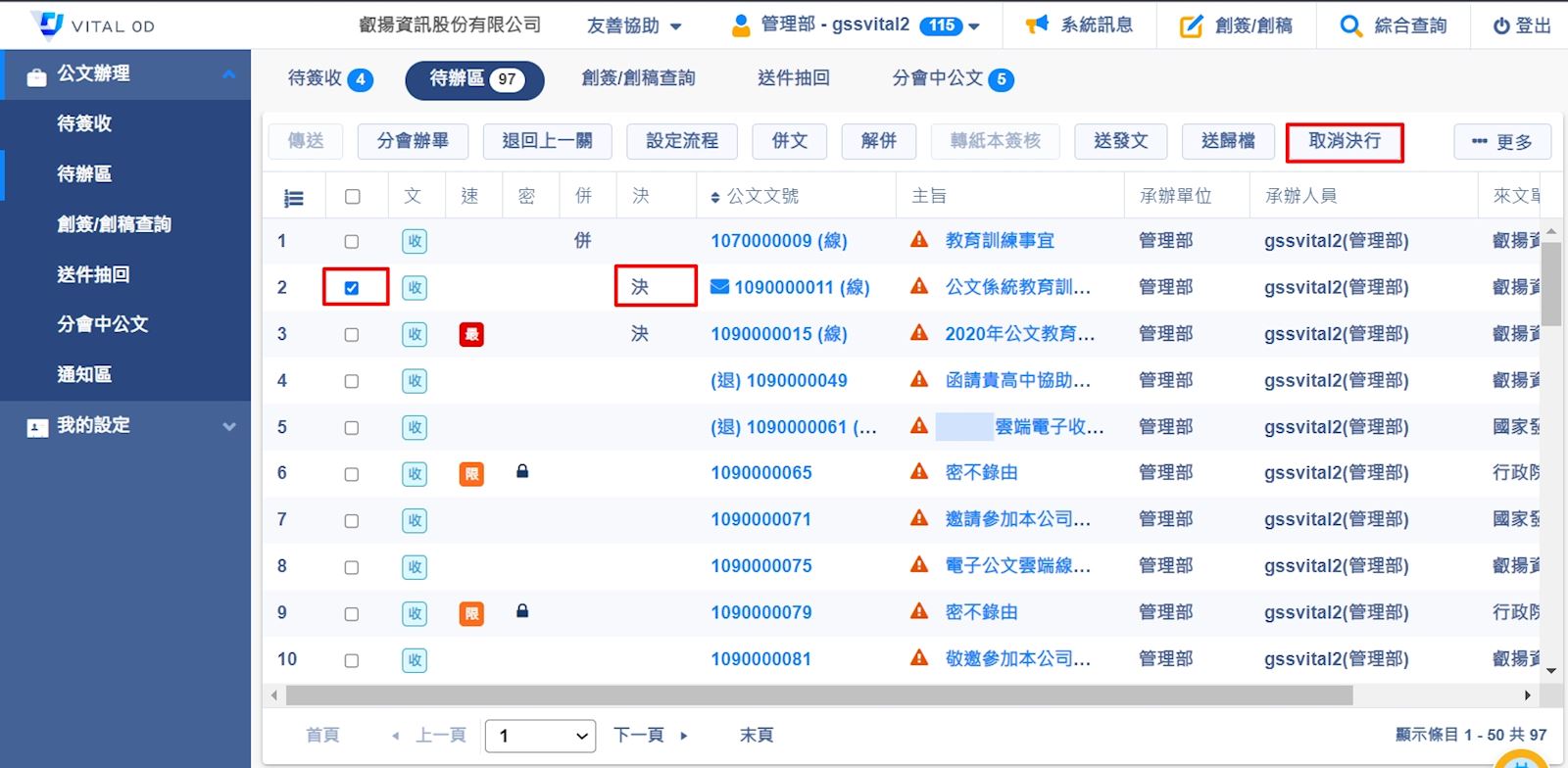 1. 決行後公文承辦人無法更換附件,除非要【取消決行】承辦人才可以進入公文文號加上附件。