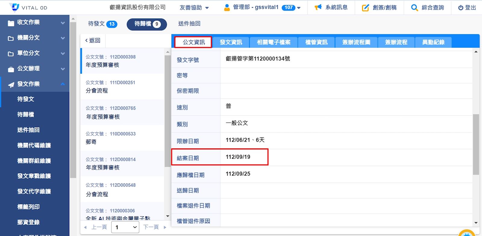 當公文送發文,發文人員按下【發文結案】,就會壓入【結案日期】,當公文存查沒發文時,該份公文送歸檔時,系統就寫入送歸檔當天的日期為【結案日期】。此時代表該份公文已經結案。您也可以點選公文【主旨>公文資訊】的頁籤查看【送歸日期】,您可以點選公文【主旨】在【公文資訊】的頁籤可以看到結案日期