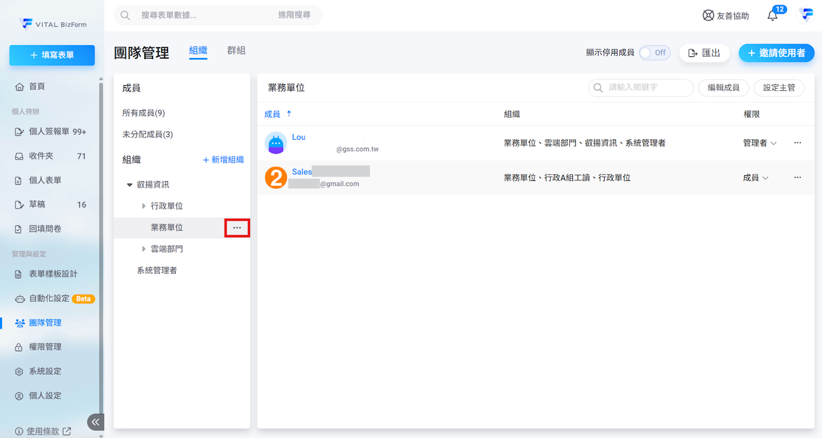 若要更新組織名稱,請點選欲更改的組織名稱,組織名旁即會出現三個點【...】