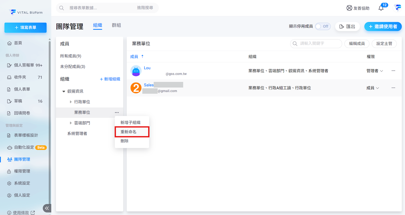 若要重新命名組織名稱,請點選欲修改之組織,名稱旁會有三個點,點擊之後點選重新命名即可。若欲知詳細內容,請閱讀FAQ說明