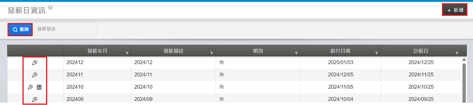 2. 點選【查詢】可看到所有發薪日資訊,點選【鉛筆】進入編輯,或點右上角【新增】建立一筆新的資料。