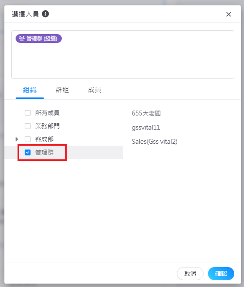 2. 接著,進入欲設定簽核流程的表單格式,選擇人員時,可選擇「組織」並勾選組織名稱。