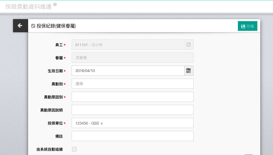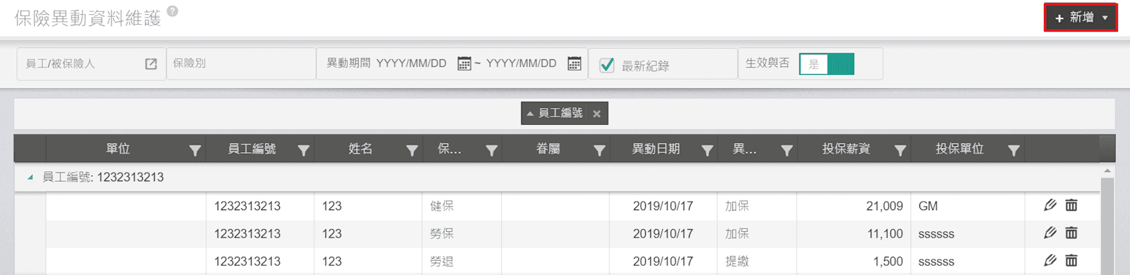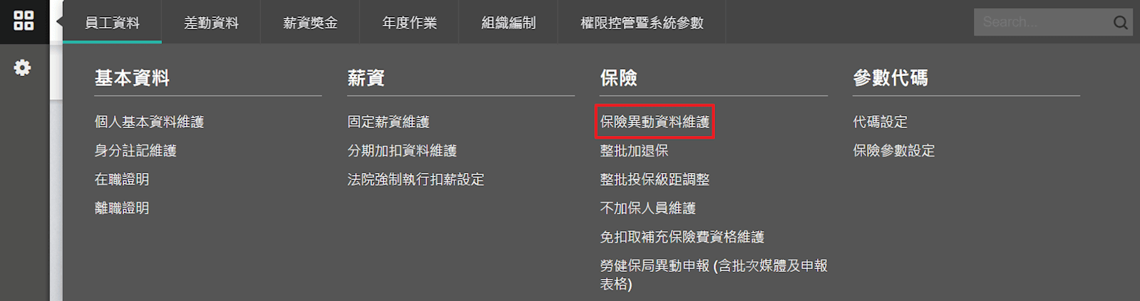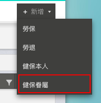 1. 請至【員工資料>保險>保險異動資料維護】頁面中,右上角點擊「新增>健保眷屬」,請在此新增退保紀錄