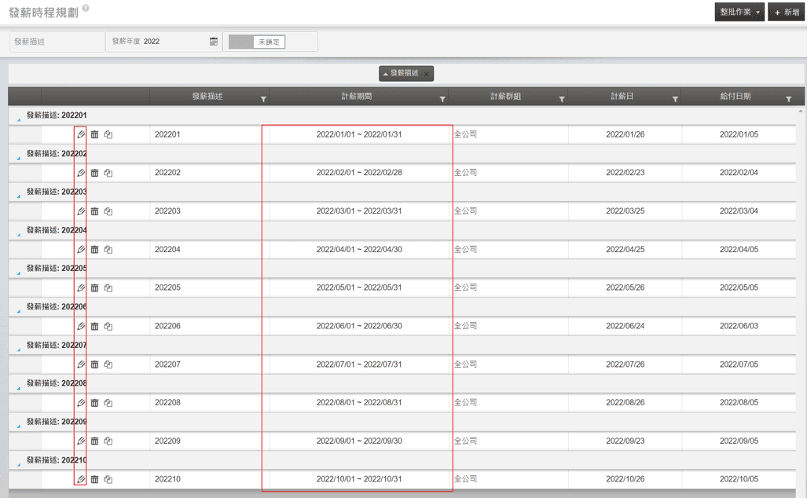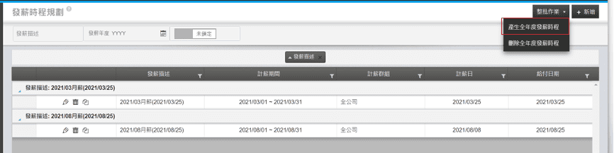 1. 請至【全站功能>薪資獎金>計算及發放>發薪時程規劃】,透過整批作業產生全年度發薪時程。