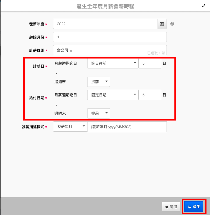 3. 填入發薪時程後,按下右下角產生,即可產出整年度發薪時程。