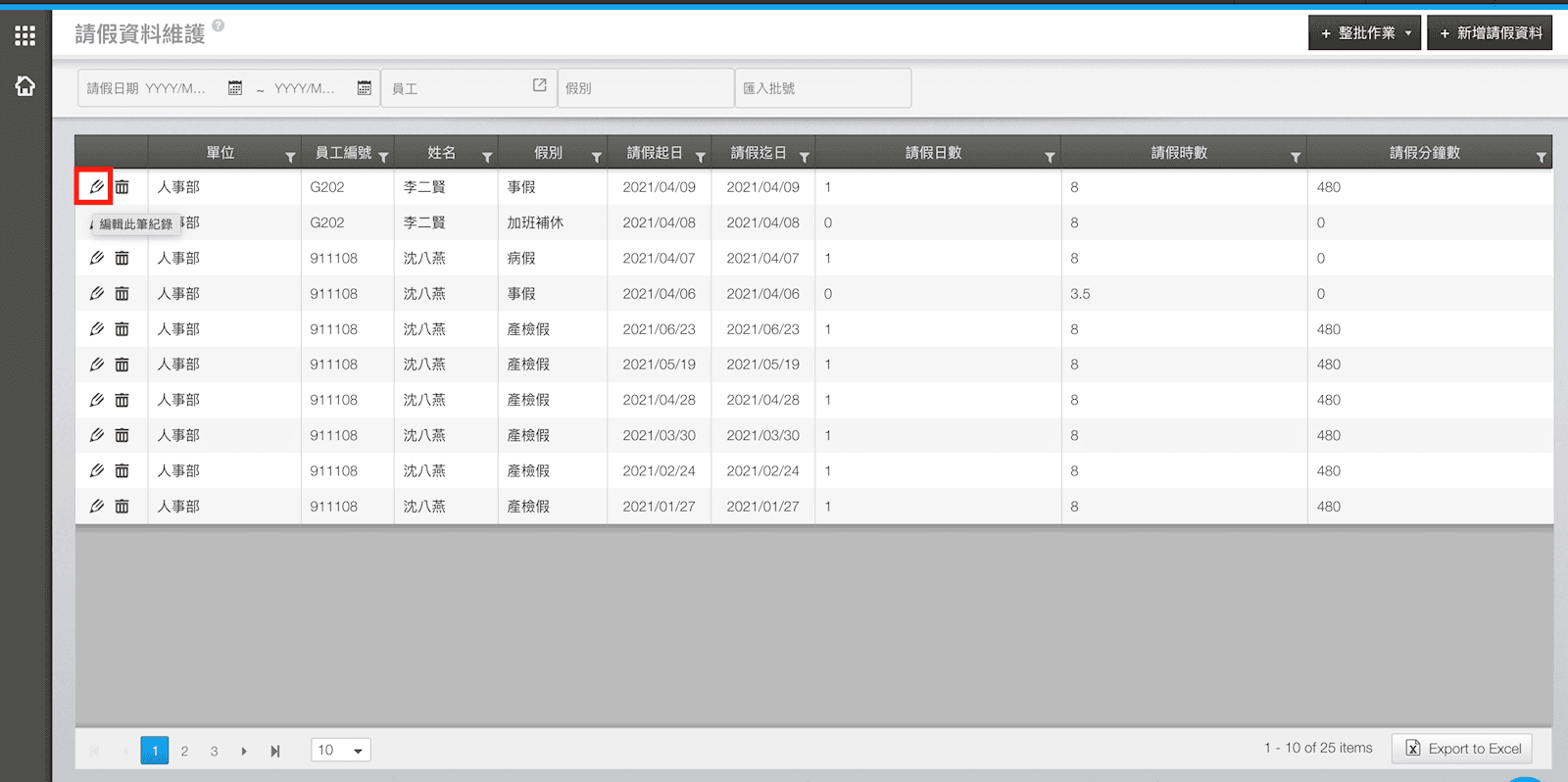 表單送出後,起單人即無法修改。若主管還在審核中,可以請主管將表單退回;若表單已經審核通過,可以請人資至【請假資料維護】中修改。