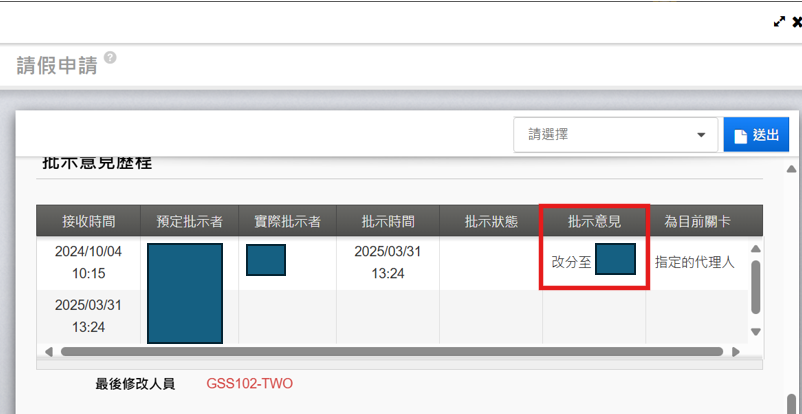 查看表單明細中的[批示意見],會顯示改分至XXX