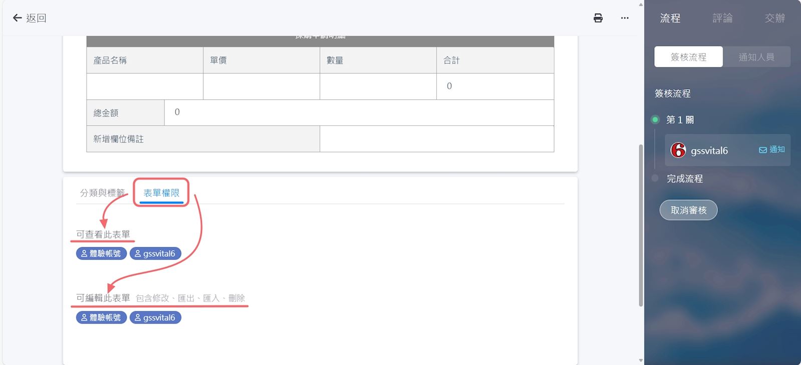 點擊表單下方【表單權限】按鈕,就可以看到誰有權限查看、編輯此表單。若要設定表單權限請參考 此篇FAQ。
