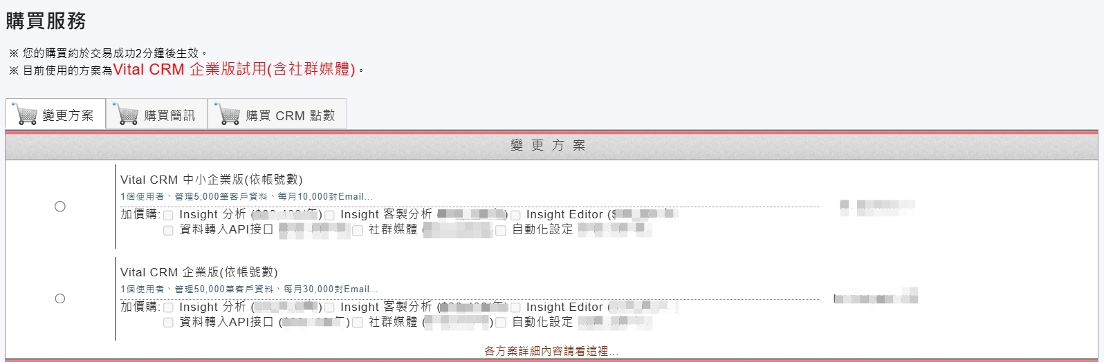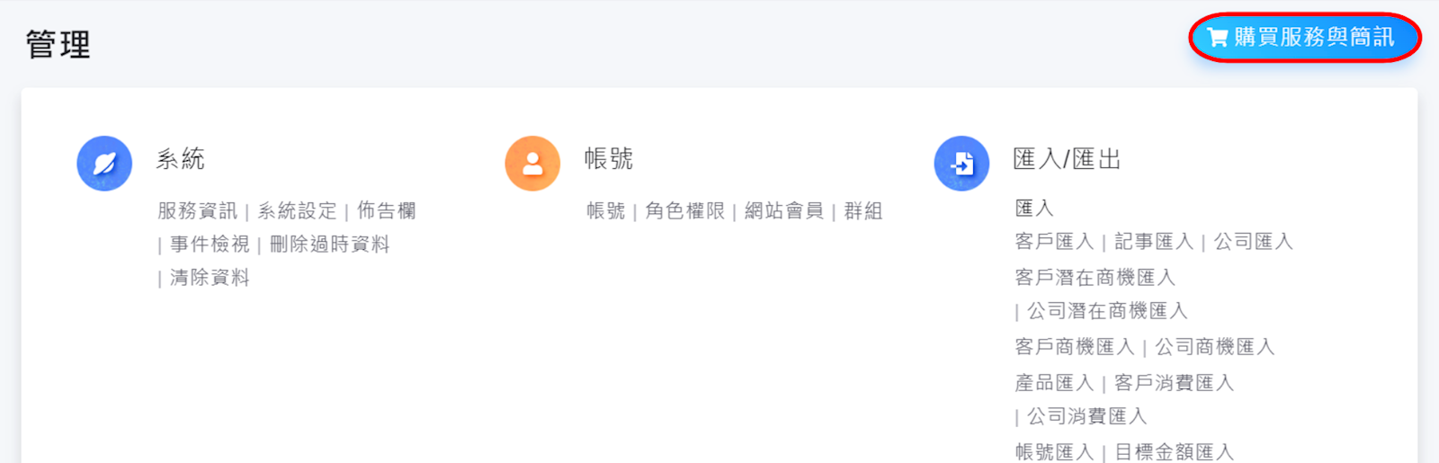 1. 請先進入【管理】功能,並點擊右上方藍色的購物車按鈕,在此可變更方案、線上續約,或加購其他功能項目。