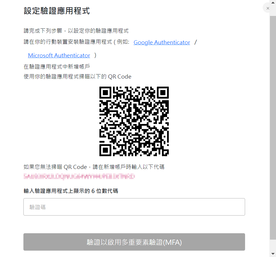 請在您的行動裝置安裝驗證應用程式,安裝完成後掃描QR Code,輸入驗證應用程式上顯示的6位數代碼,最後點選驗證以啟用多重要素驗證(MFA)。