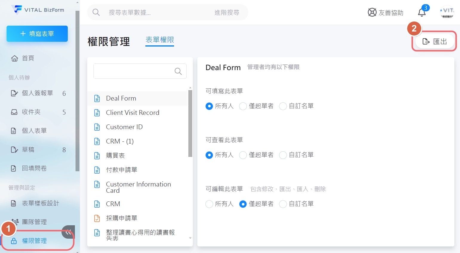 點擊左側功能選單的【權限管理 > 匯出】,即可將所有樣板的權限匯出成 Excel 檔。