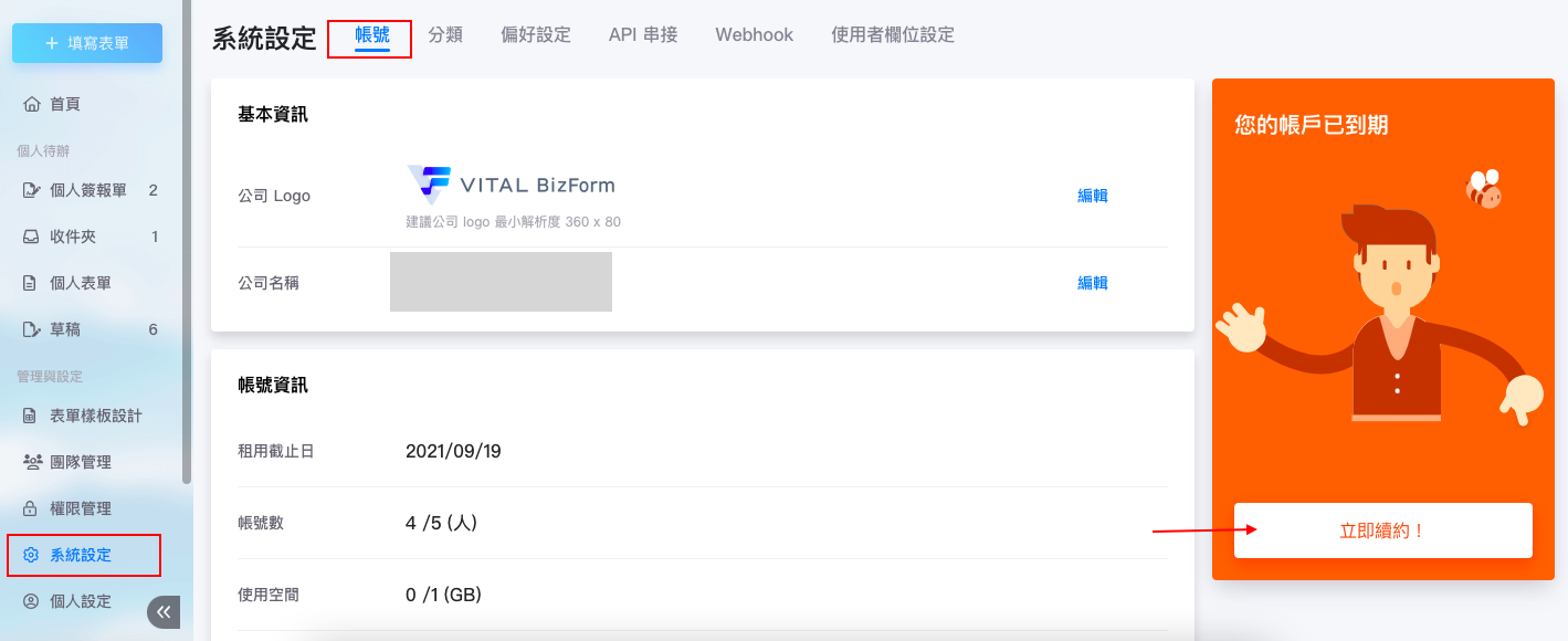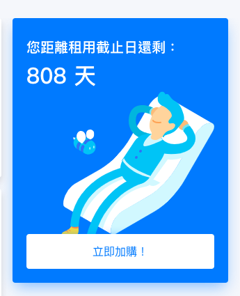 1. 點選【系統設定>帳號】,右邊有「立即加購/立即續約」的按鈕。