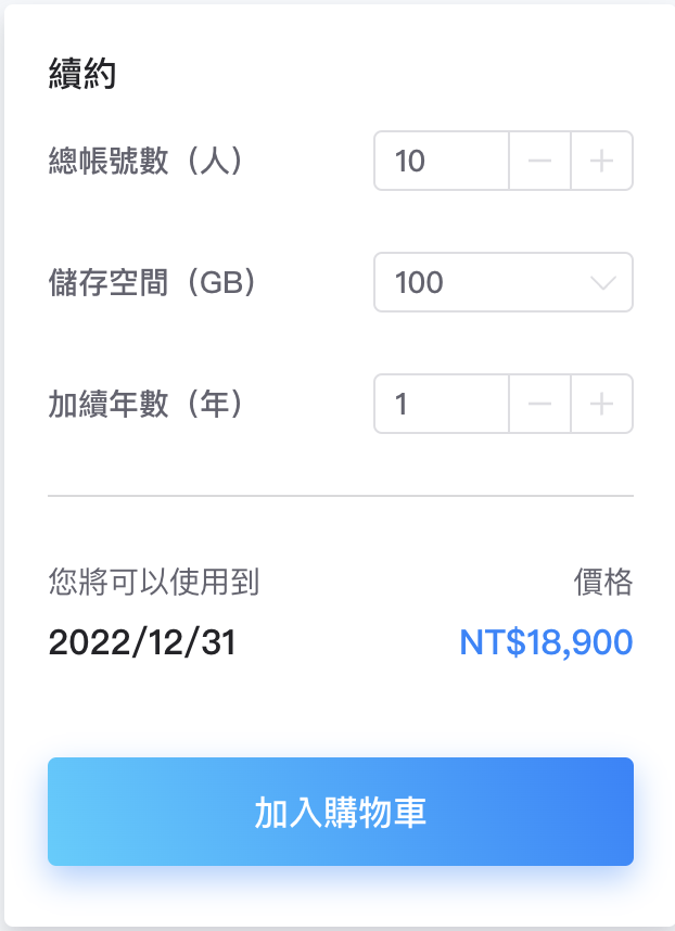 2. 點擊後,可以選擇「帳號數」、「儲存空間」、「續約年數」,下方會顯示使用年限和價格,確認無誤,點擊「加入購物車」並接著結帳即可。
