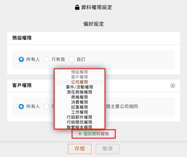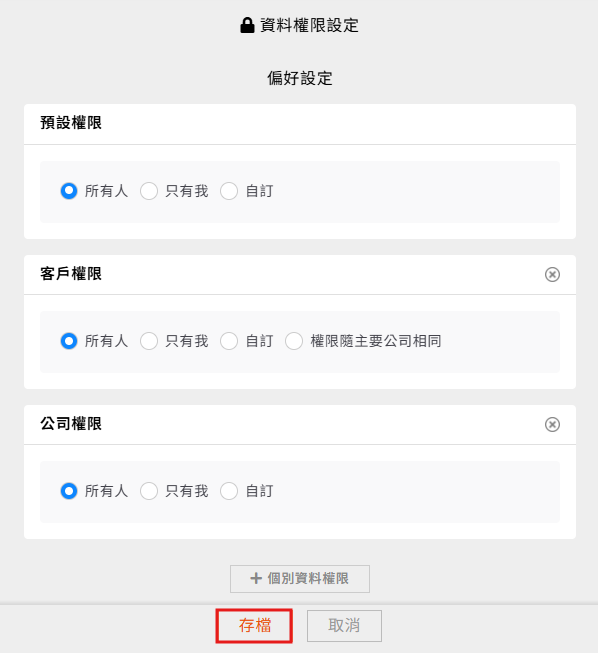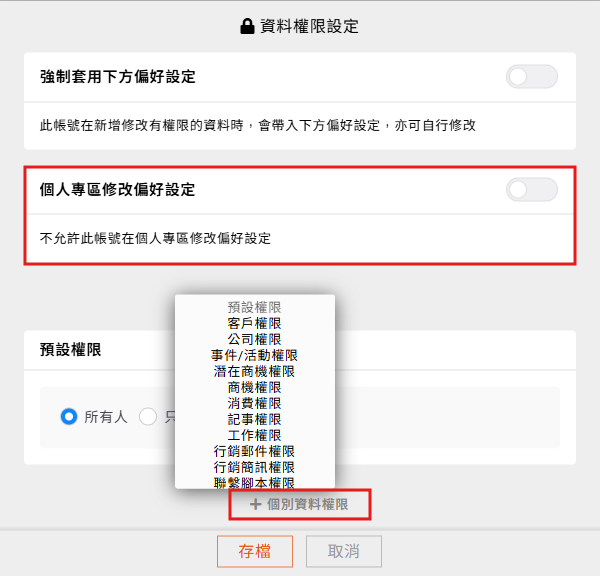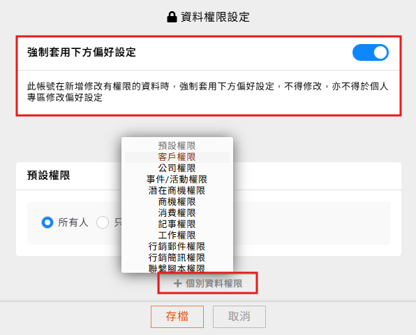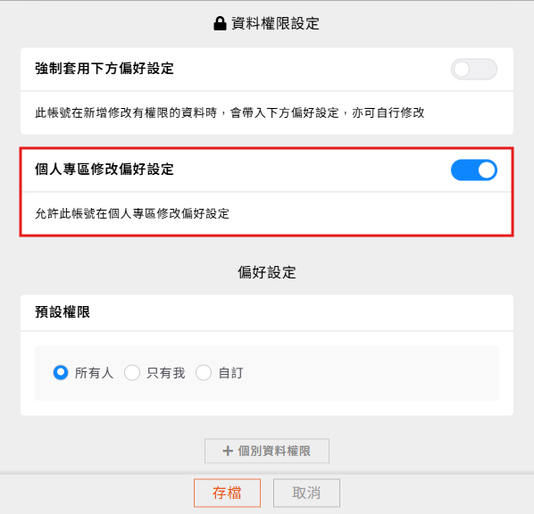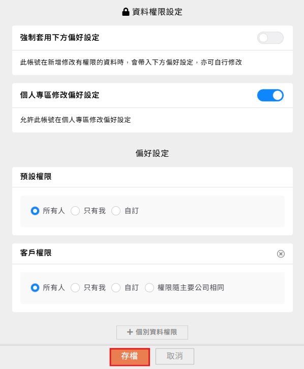 5. 若不要允許員工自行修改權限設定可以關閉此功能或開啟【強制套用下方偏好設定】,並在下方點選【個別權限設定】來設定員工的預設資料權限。