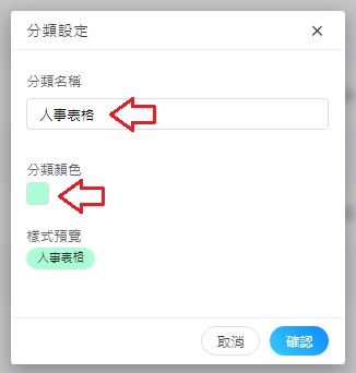 可以在新增分類的畫面中,輸入分類的名稱、選擇分類的顏色,最下方可以預覽樣式。