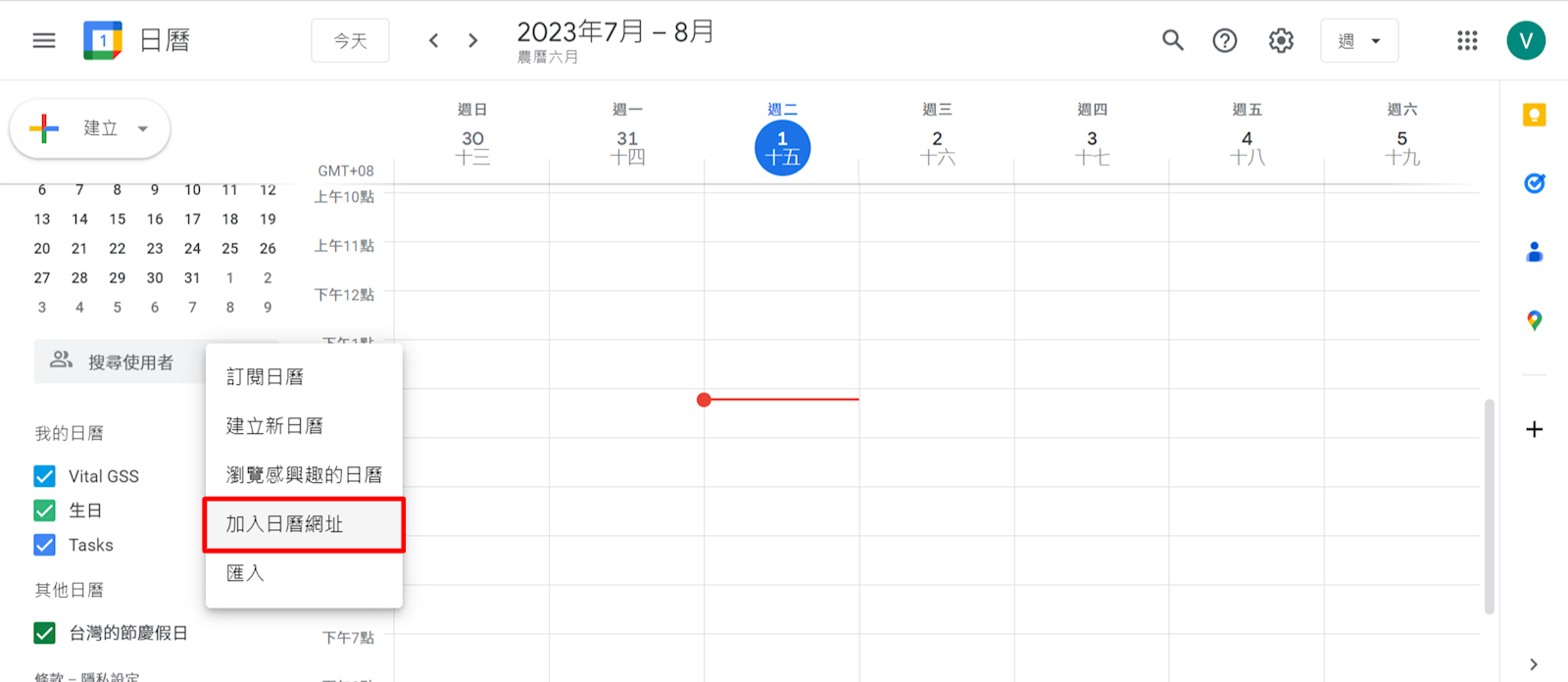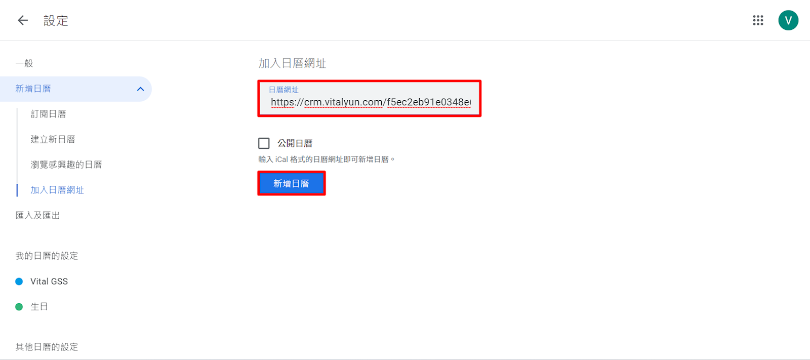 3. 選擇選單中的【加入日曆網址】,將 Vital CRM 訂閱行事曆的連結貼上,接著點選【新增日曆】,就完成串連了。